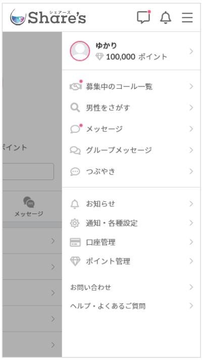 Share’sは、六本木、恵比寿、渋谷、新宿を中心に待ち合わせを行い、飲み会やデート、接待など様々なシーンに同席し、おもてなしを行うサービスです。サービスを利用して、飲み会やタイムシェアをすることを、コールと呼びます。コールには、フリーコールと指名コールの2種類のコールがあります。