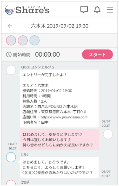 マッチングしたら、 グループメッセージから、 合流場所などを聞いて、 待ち合わせをしましょう。※鍵のかかる個室などを指定された場合は、お断りして速やかに運営にご報告ください。