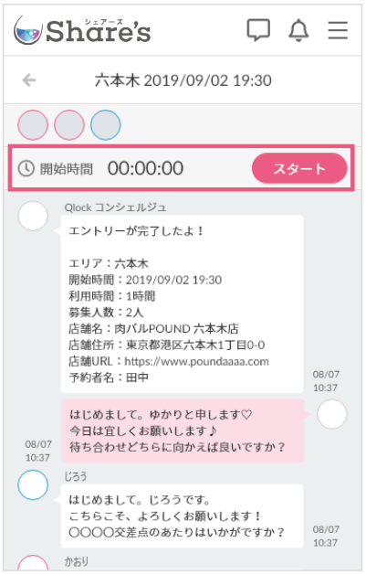 男性と合流したら、男性にも確認をした上で、スタートボタンを押してください。※合流していないのみも関わらずスタートボタンを押す行為は禁止しています。解散予定時刻を過ぎると、延長は自動でされます。